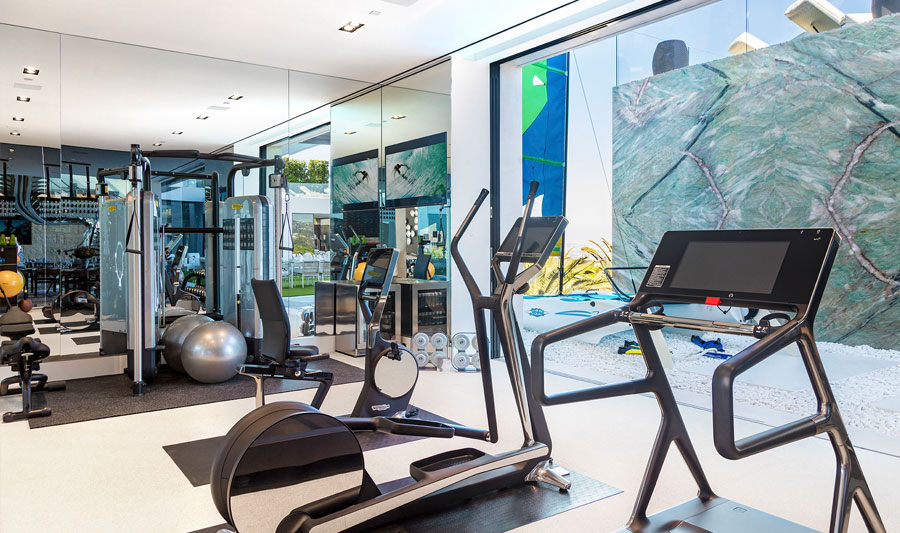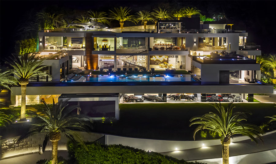 This triumphant marvel includes two master suites, 10 oversized VIP guest suites, 21 luxury bathrooms, three gourmet kitchens, five bars, a massage studio/wellness spa, state-of-the-art fitness center, and an 85-foot glass tile infinity swimming pool.